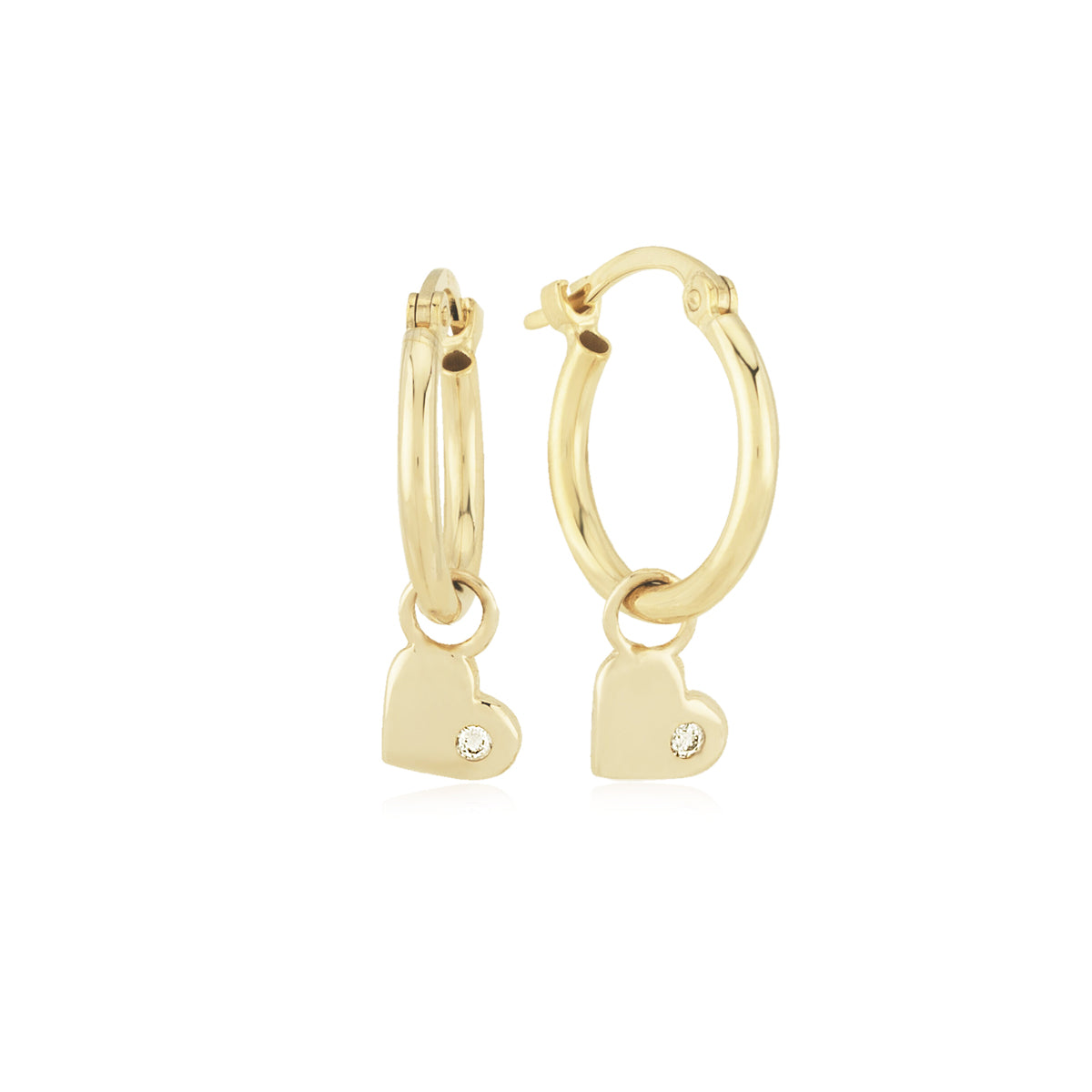 14k yellow gold small hoop earrings with heart dangle & .02ct diamonds
