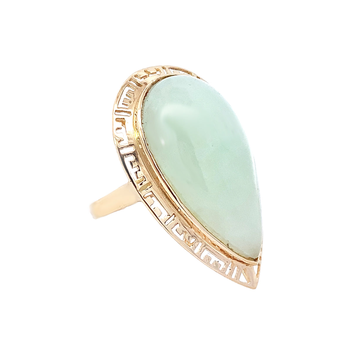 14k yellow gold large Vintage pear shaped light green jade Statement ring, size 8