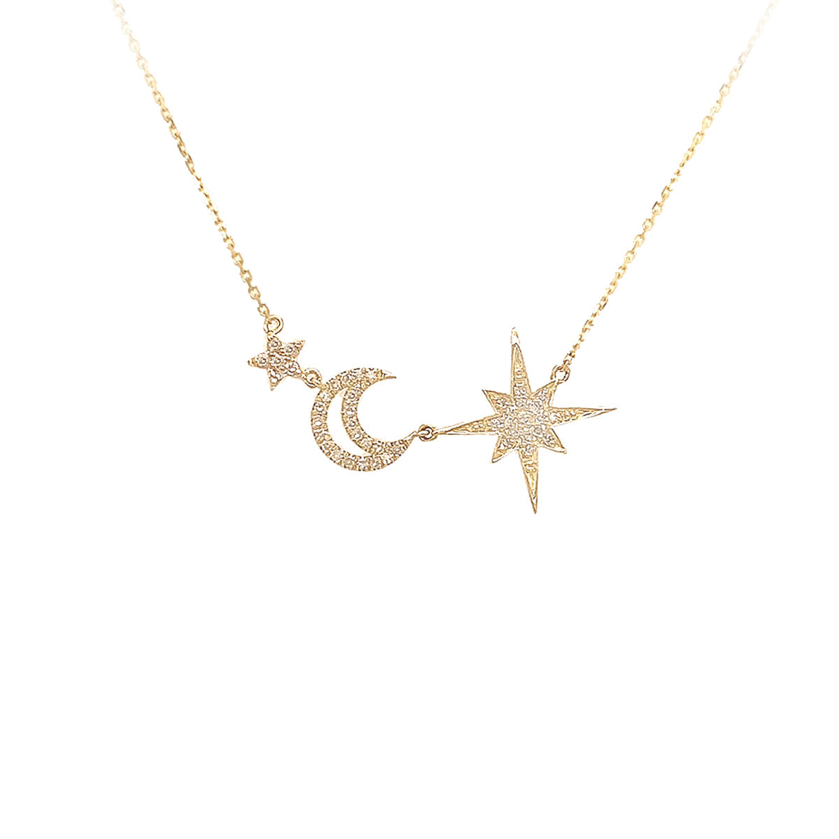 14k yellow gold 18" .16ct diamond Moon and Stars necklace