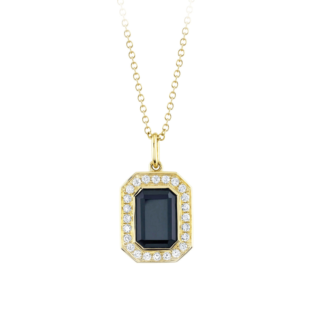 14k yellow gold 18" small faceted onyx tag pendant by Shy Creation with 0.27ct diamond halo