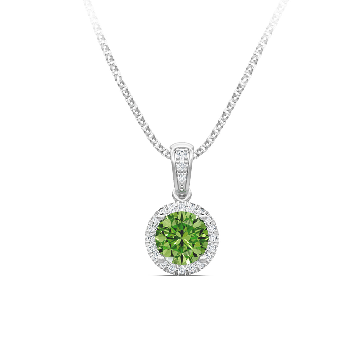 14kt white gold 18" 6mm round peridot & 0.10ct diamond halo pendant. For the lime green color lover, or to commemorate an August birthday.