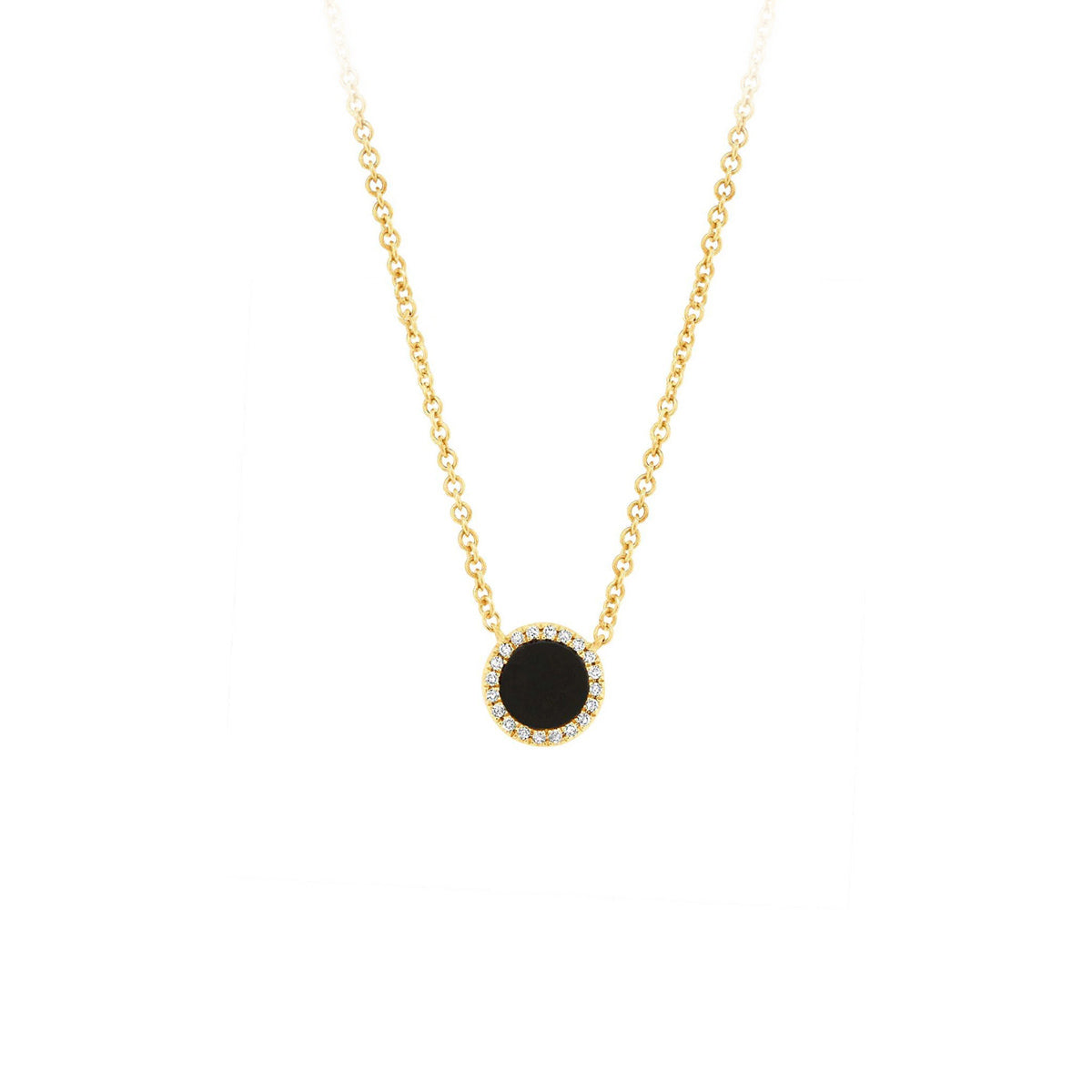 14k yellow gold 18" small onyx round disc necklace with .04ct diamond halo
