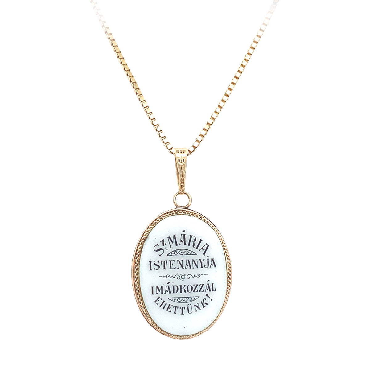 14kt yellow gold 18" Vintage hand painted Hungarian "St. Maria" medal. The words on the rear translate from Hungarian to "St. Mary Mother-of-God for us".