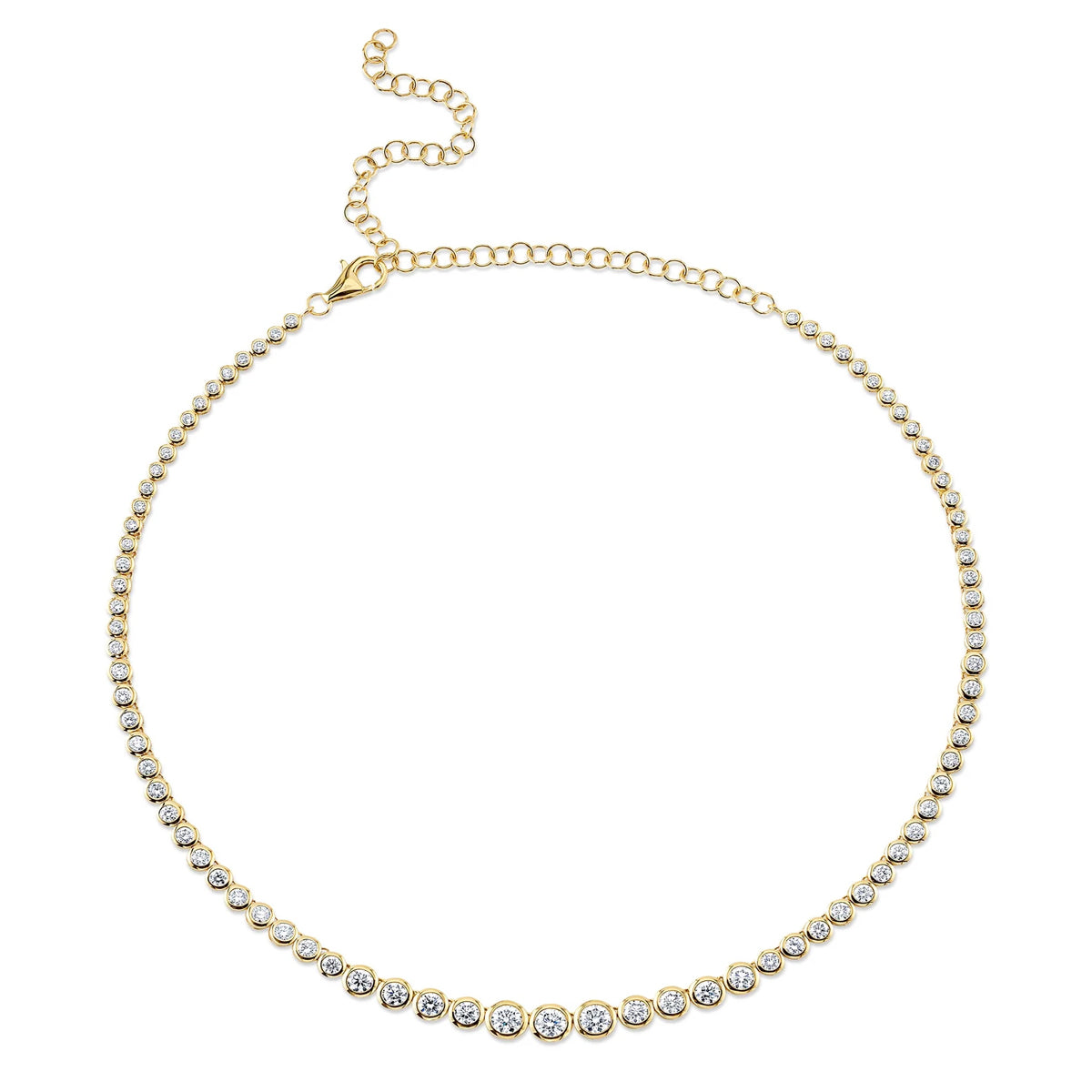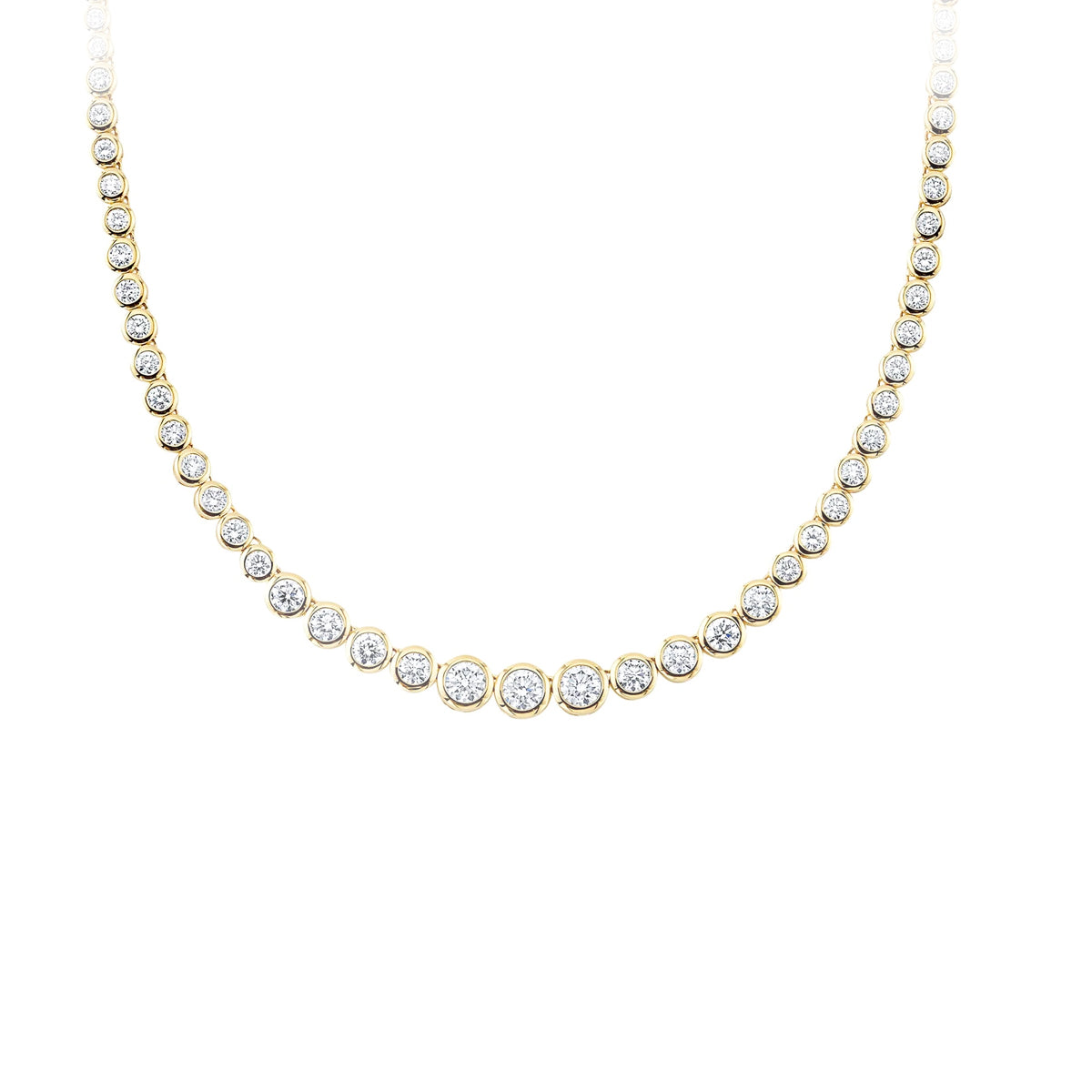 14kt yellow gold 18" bezel-set 5.70ct diamond tennis necklace by Shy Creation with chain at rear to adjust length