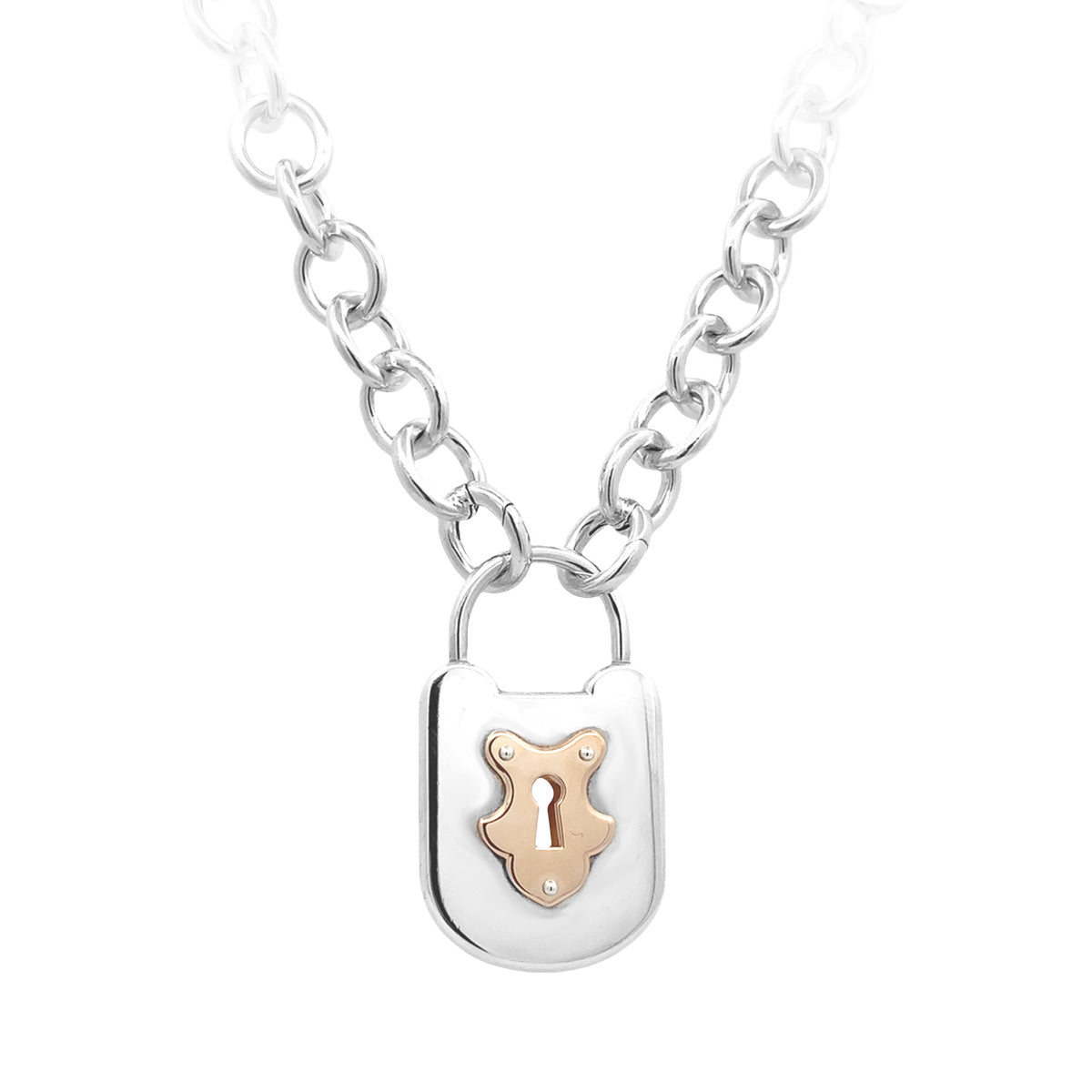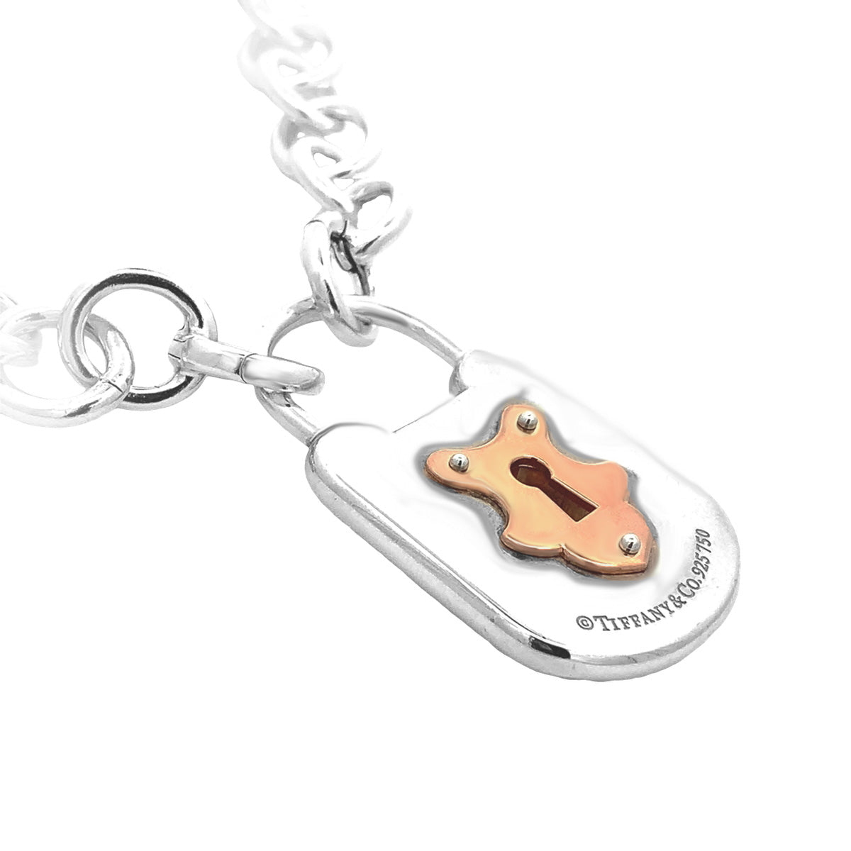 Sterling silver & 18k rose gold large Vintage Tiffany "Lock" pendant on 25" non-Tiffany heavy 11mm cable chain. The cable link chain has hidden clasps, and can be separated into an 18" necklace and a 7" bracelet. Chain and bracelet can be worn alone. Lock pendant does not open.