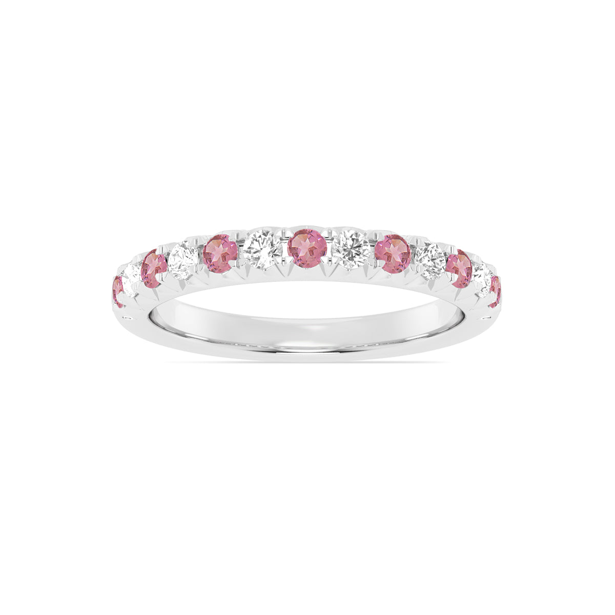 14kt white gold 2.2mm pink tourmaline & 0.25ct diamond fishtail band, size 6. A stackable band for the pink lover, or to commemorate an October birthday.