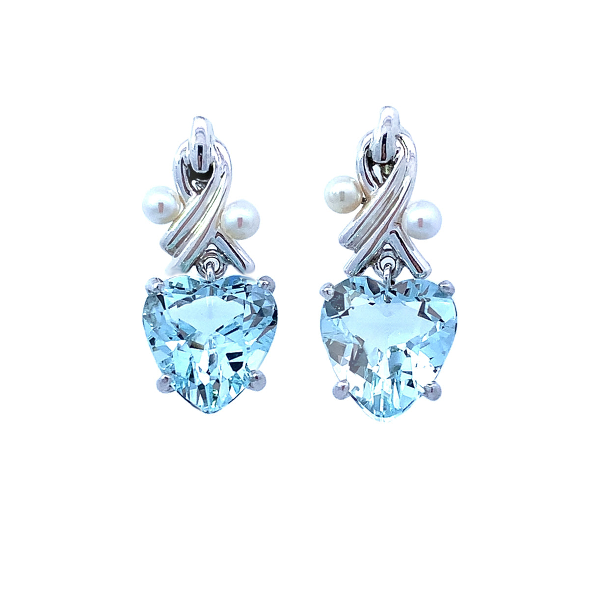 14k white gold Vintage aquamarine heart drop earrings with small pearls