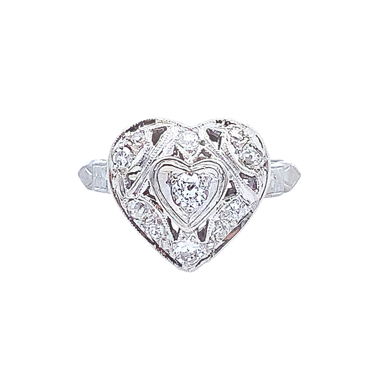 14k white gold Vintage 0.29ct filigree diamond heart ring, size 7.5