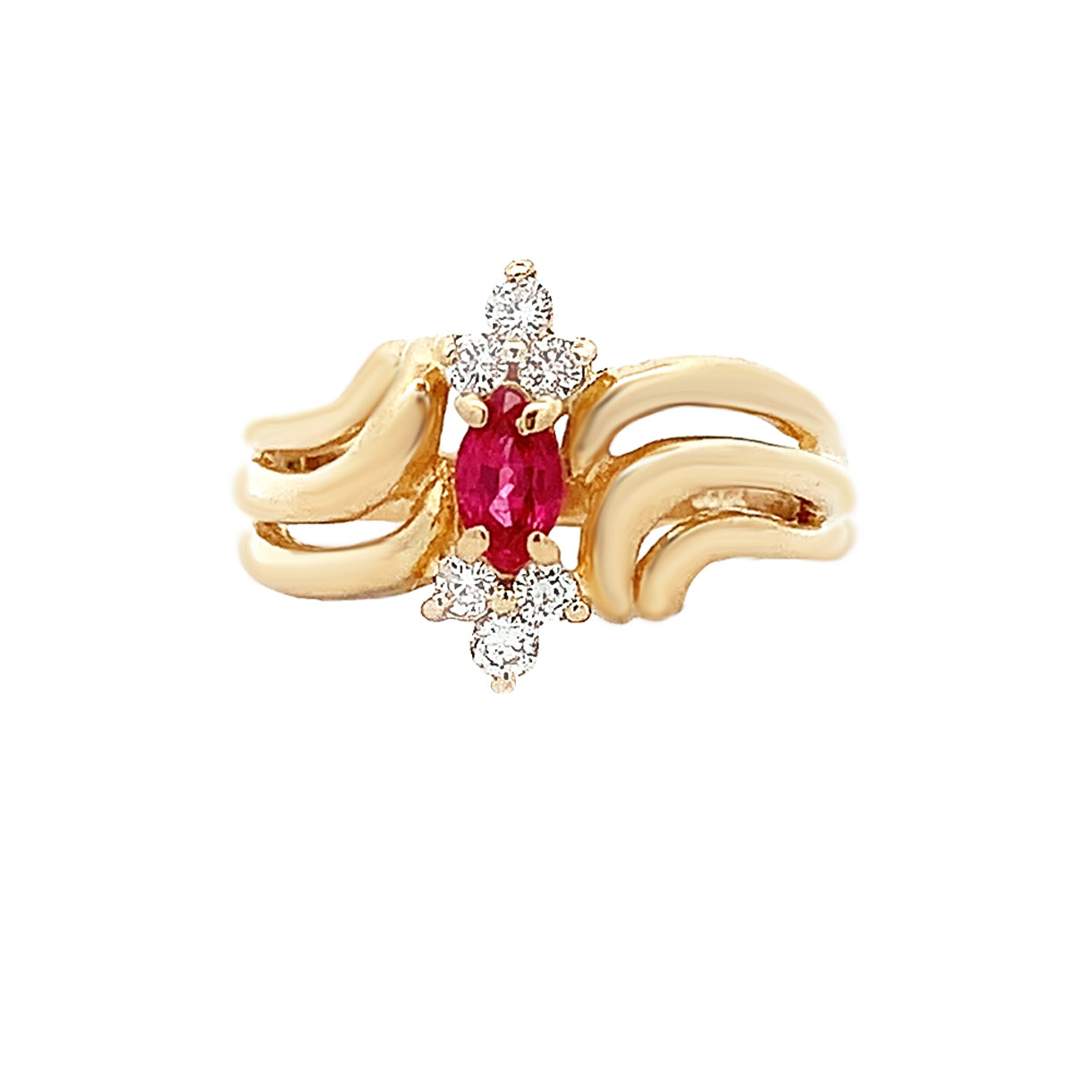 14k yellow gold Vintage marquise ruby bypass ring with 0.16ct diamonds, size 6.5